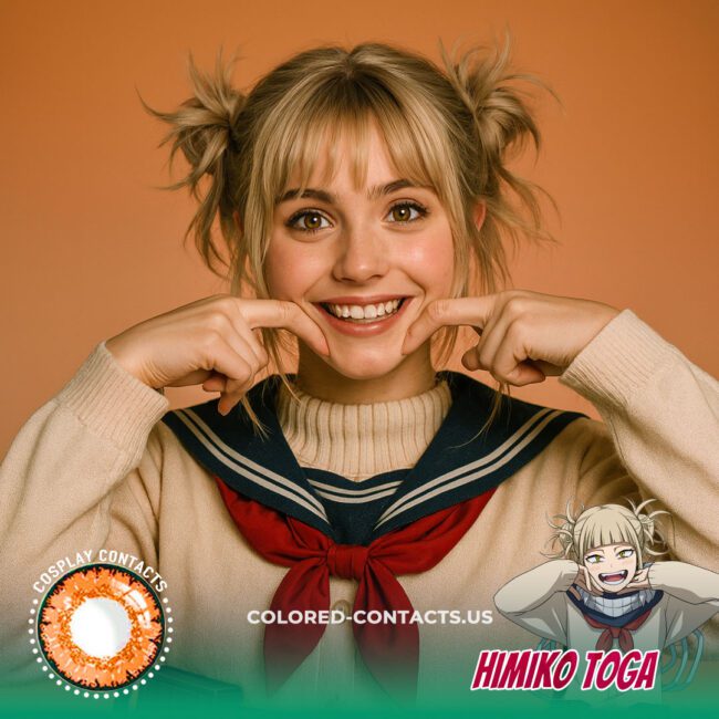 Himiko Toga Cosplay Contact Lenses perfectly capture the unhinged gaze of this blood-obsessed villain with chilling accuracy. These specialized orange colored contacts feature a haunting amber-gold hue that embodies the twisted fascination and predatory intensity of this infamous character from the “My Hero Academia” universe. The dimensional orange effect creates the perfect balance of childlike excitement and menacing bloodlust essential for an authentic Toga portrayal.