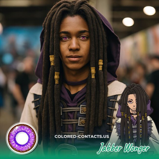 The purple cosplay contacts showcase a rich, vibrant violet that perfectly embodies Jabber’s eccentric personality and mad scientist aesthetic. This intense purple shade transitions from deeper plum tones at the outer edges to brighter, almost electric lavender highlights toward the center, creating that signature chaotic brilliance in his gaze.